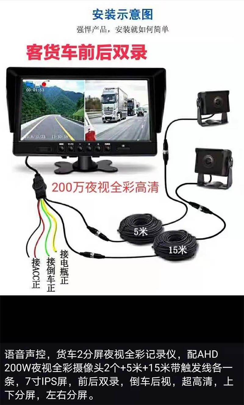 200W夜視全彩攝像頭2個(gè)+5米+15米帶觸發(fā)線各一條,7寸IPS屏,前后雙錄,倒車后視,高清,上下分屏,左右分屏。